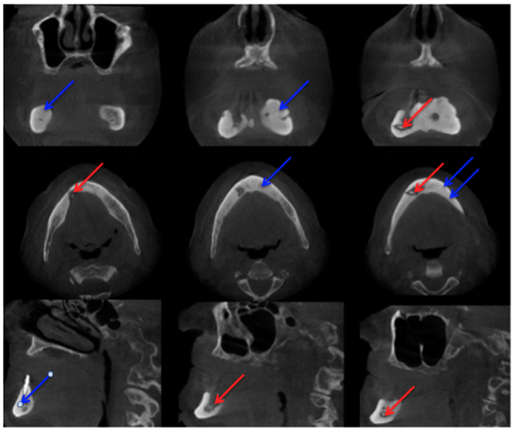 Cone-beam computed tomography (Carestream CS 9300) Patient: 77 years old, metastatic prostate cancer, ibandronic acid and later another antiresorptive drug: denosumab. For panoramic radiograph see Figure 2. 1st row: coronary view; 2nd row: axial view; and 3rd row: sagittal view. Red arrows: sequester; blue arrows: sclerotic region. AAMOS staging: stage 2.