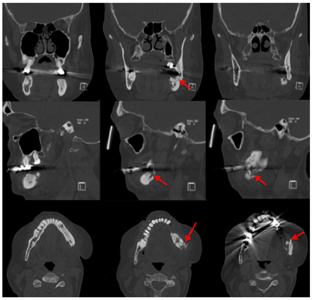 - Krishnan, A.; Arslanoglu, A.; Yildirm, N.; Silbergleit, R.; Aygun, N. Imaging findings of bisphosphonate-related osteonecrosis of the jaw with emphasis on early magnetic resonance imaging findings. J. Comput. Assist. Tomogr. 2009, 33, 298–304. [Google Scholar] [CrossRef] [PubMed]