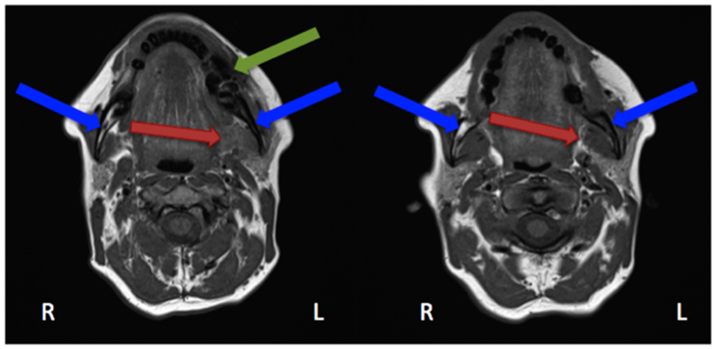 Magnetic resonance imaging (Siemens, Avanto, 1.5T, Sequence: T1 tse tra) Patient: 48 years old, female, metastatic breast cancer, zoledronic acid for 2 years (panoramic radiograph Figure 1). Green arrow showing the MRONJ necrosis, red arrows showing the oedema, blue arrows showing the differences between the right side: normal fatty bone marrow and left side: signal loss, due to loss of fat. Pair of screenshots. AAMOS staging: stage 2.