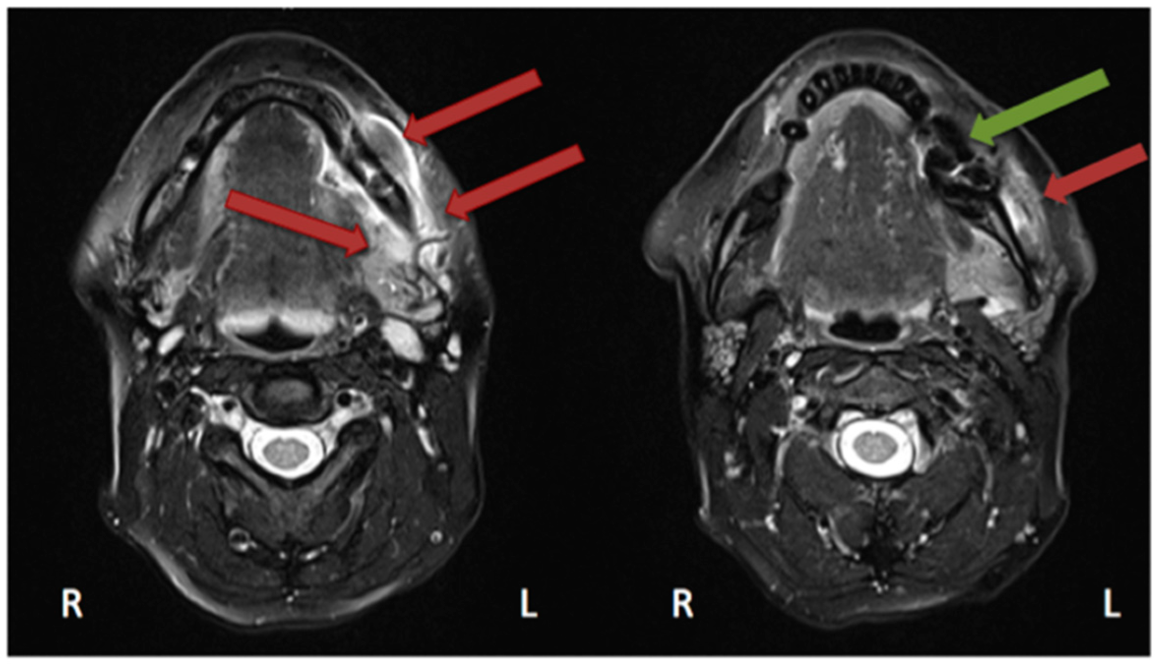 Magnetic resonance imaging (Siemens, Avanto, 1.5T, Sequence: T2 tse tra) Patient: 48 years old, female, metastatic breast cancer, zoledronic acid for 2 years (panoramic radiograph Figure 1). Green arrow showing the MRONJ necrosis: hypointense bone marrow, red arrows showing the oedema. Pair of screenshots. AAMOS staging: stage 2.