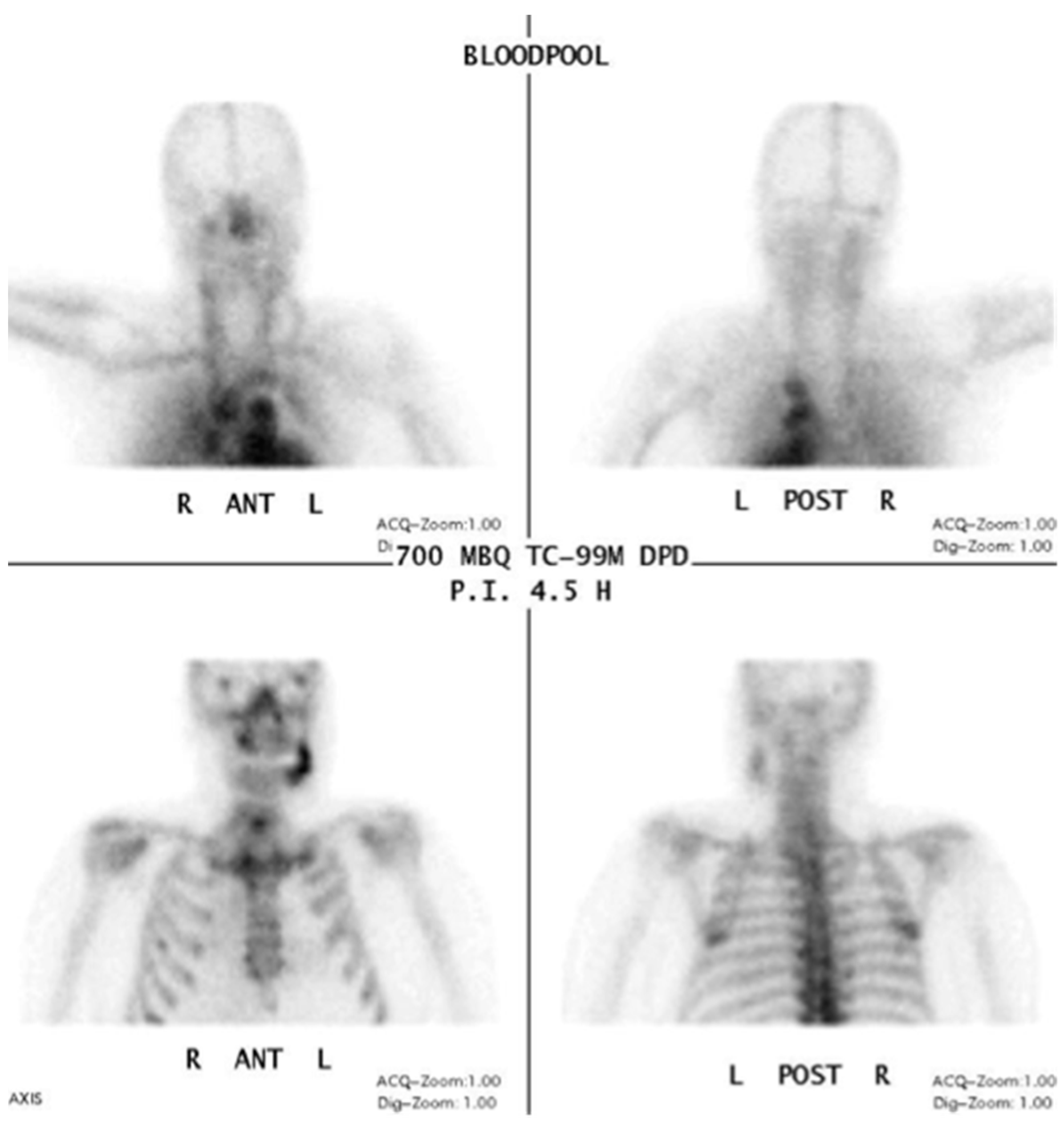 - Kakhki, V.D.; Zakavi, S.R. Age-related normal variants of sternal uptake on bone scintigraphy. Clin. Nucl. Med. 2006, 31, 63–67. [Google Scholar] [CrossRef] [PubMed][Green Version]
