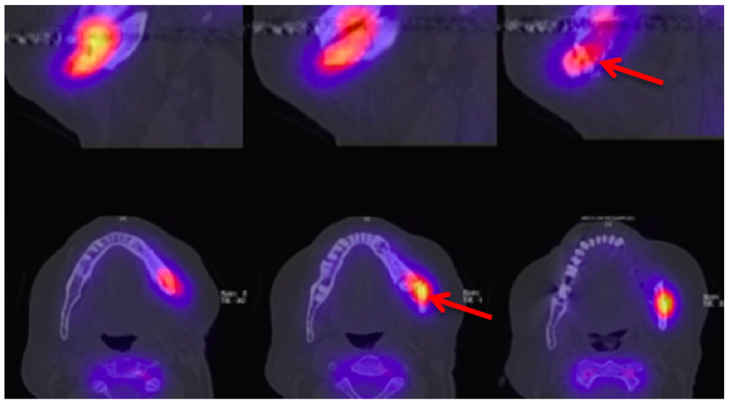 - Belcher, R.; Boyette, J.; Pierson, T.; Siegel, E.; Bartel, T.B.; Aniasse, E.; Stack, B. What is the role of positron emission tomography in osteonecrosis of the jaws? J. Oral Maxillofac. Surg. 2014, 72, 306–310. [Google Scholar] [CrossRef] [PubMed]