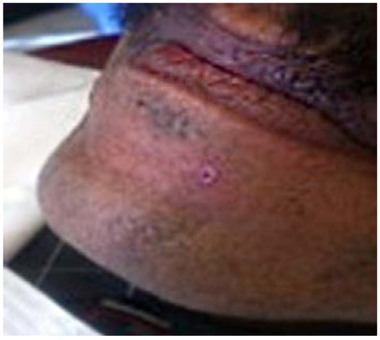 Later in the day, the dentist felt a slight hardness and slight pain upon palpitating the area. By the next day, the swelling had progressed slightly and the dentist felt a slight pain upon palpitation or any movement, such as chewing Figure 1 and Figure 2. He did not think that the small piece of bur was lodged in his chin. A decision was made to have radiographs taken, which included a panoramic and a peri-apical radiograph. Subsequent review of the radiographs revealed a radiopaque image consistent with a broken piece of the bur in the soft tissue of his chin, in the vestibule of the mandibular anterior left side Figure 3 and Figure 4.