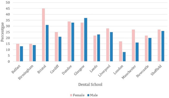 The percentage of male and female graduates (2000 to 2004) from each dental school who obtained a postgraduate qualification.