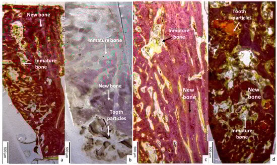 - Kim, S.G.; Kim, H.K.; Lim, S.C. Combined implantation of particulate dentin, plaster of Paris, and a bone xenograft (Bio-Oss) for bone regeneration in rats. J. Craniomaxillofac. Surg. 2001, 29, 282–288. [Google Scholar]
