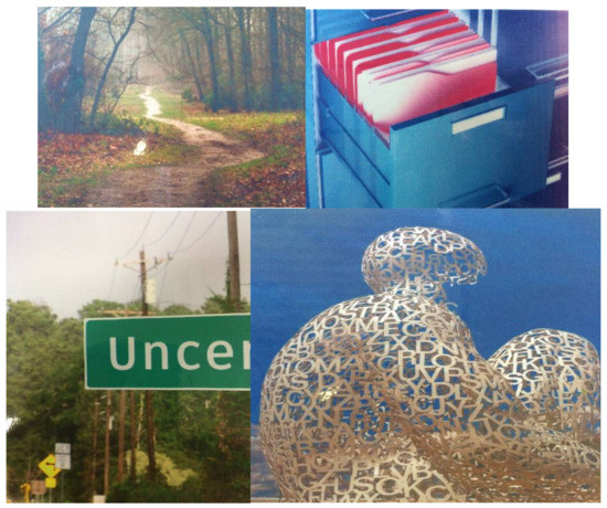 Some examples of the images shown to participants. The first image of a path through a forest can be interpreted as a clear pathway through the course; a pathway which has no ending or in which the trees are blocking the wider view. The second image of a filing cabinet can be interpreted as a neat storage place for knowledge; the open file could indicate ongoing work, or this could be one drawer amongst several that compartmentalise learning. Image three shows the uncertainty of what lies ahead; what does the sign actually say, and in what direction are we heading? Image four can be interpreted as a transparent body, where the learning taking place is transparent, students can see through the body of knowledge and see exactly what they are getting.