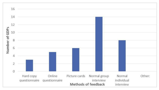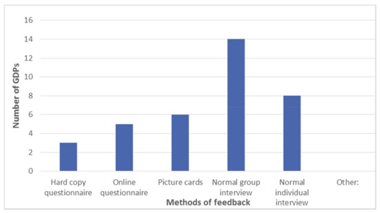 When asked about which method the GDPs preferred to give their feedback, it was clear that 54% (n = 14) considered giving feedback via a normal group interview was their preferred method (Figure 6). Although the picture cards had stimulated thought and discussion, only 23% (n = 6) thought that this was their preferred method of giving feedback (Figure 6).