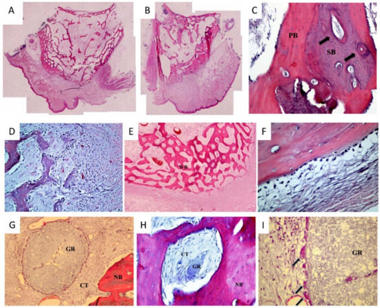 Representative histological pictures (H&E staining). (A) Site grafted with the resorbable alloplastic biomaterial at 12 weeks. The site is filled with regenerated bone, bone marrow and connective tissue. At the periphery of the socket, native cortical bone can be identified in continuity with the newly formed cancellous bone in the center. At this time point, most of the easy-graft CLASSIC particles have been resorbed; (B) Nongrafted extraction site at 12 weeks. Regenerated bone showing active remodeling; (C) At the center, mature secondary bone (SB) with harversian systems (arrows) can be observed, surrounded by less mature primary lamellar bone (PB). These types of bone are clearly separated by cement or reversal lines; (D) Newly formed bone trabeculae with osteoblast lining at the periphery, and connective tissue with numerous mesenchymal cells; (E) Newly formed woven bone (WB) sealing the entrance of the extraction socket; (F) Periosteum-like connective tissue covering the periphery of the socket with linear arrangement of osteoblasts; (G) Residual granule of easy-graft CLASSIC (GR) surrounded by connective tissue (CT) and newly formed bone (NB); (H) Remnant of easy-graft CLASSIC (GR) surrounded by a few multinucleated cells and connective tissue (CT) with blood vessels, fibroblasts, and collagen fibers. At the periphery, newly formed bone (NB) is present; (I) Multinuclear cells (arrows) lining the periphery of a granule of easy-graft CLASSIC (GR).