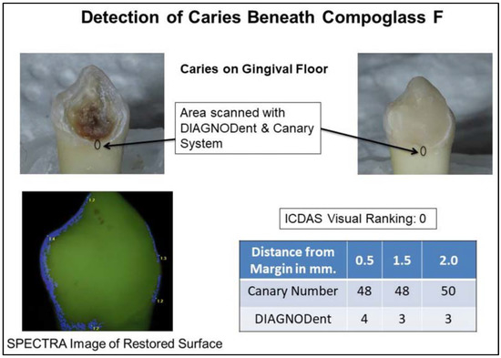 Fluorescence-based caries detection devices may encounter challenges in detecting caries around RMGIC and compomer margins. Some studies have found that measuring fluorescence may not be suitable for detecting caries around restoration margins due to false positive readings [25,55,56,57]. The CR Clinicians Report (March 2012), found that existing restorations may cause interference in readings from these devices [58]. Fluorescence-based technologies may not give any information about lesion size, volume or depth [59,60]. Scattering of the light and fluorescence caused by stain, plaque, organic deposits and surface features such as pits and fissures may prevent deep penetration of the light below the tooth surface. In this study, SPECTRA images were not able to detect caries beneath the restoration margins in vast majority of the tooth samples (Figure 2 and Figure 3).