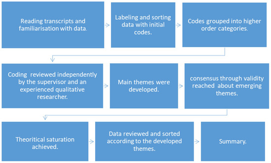 Data were audio-recorded on two separate recording systems to guarantee no loss of data. The records were transcribed into Microsoft Word (2013, Microsoft Corporation, WA, USA,) and the participants were given different names in the transcribed data to ensure full confidentiality. The transcripts were then uploaded to a qualitative data analysis software (MAXQDA standard, VERBI Software, Berlin, Germany). The software was used by the researcher for thematic analysis by systematically evaluating and interpreting textual data. A cross-sectional thematic analysis approach was followed in analysing the data of all focus groups. It is a flexible qualitative research analysis approach for identifying and reporting patterns of meaning across the whole dataset, thus providing a rich, detailed interpretive, yet complex, account of data [18]. It involved multiple steps, as illustrated in Figure 1.