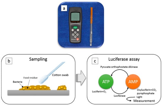 ATP + AMP swab test: (a) The portable analysis device Lumitester, (b) The test area was wiped using a special cotton swab, (c) The degree of ATP + AMP contamination was detected by wiping the test object and based on the “firefly principle”, in which ATP reacts with luciferin in the presence of luciferase to generate AMP and emits light. Using this ATP + AMP swab test, relative light emission (RLU) can be measured.