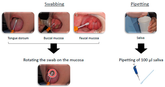 All assessments were performed chair-side in the hospital without any instruction prior to the appointment. The sampling was performed after each participant was instructed to rinse their mouth quickly with water. Oral bacteria were swabbed from the tongue dorsum, buccal mucosa, and faucal mucosa by rotating the sterilized specific cotton swab on each region. Participants were asked to spit in a paper cup to collect saliva. Subsequently, 100 μL of the saliva was transferred to a cotton swab by pipetting, as indicated in Figure 3. The cotton swab was inserted into each measuring device according to the operation manual and measured values were obtained.