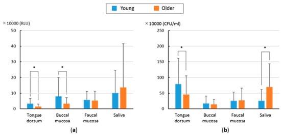 Figure 4 provides the means and standard deviations of the test values obtained from each sampling area. For the ATP + AMP swab test, the means were highest in the saliva. For the bacterial count assays, the means were higher in the tongue dorsum and saliva and lower in the faucal and buccal mucosa. The magnitude relation profiles of four sampling sites used in each test were dissimilar between the young and older groups and the profiles were different between the two tests. For the ATP + AMP swab test, the means of the data derived from the young group were significantly higher than those of older group in the tongue dorsum and the buccal mucosa. For the bacterial count, the mean of the young group in the tongue dorsum was significantly higher than that of the older group. Conversely, the mean bacterial count in saliva was significantly higher in the older group in comparison to the young group.