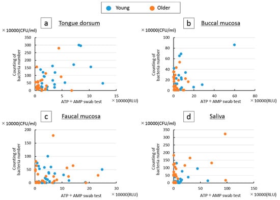 The magnitude relation profiles of the four sites sampled in each test were not similar between the young and older groups and the profiles were different between the two tests. When direct comparisons were made using the scatter charts, no significant correlation was found, suggesting that these tests did not detect similar oral hygiene conditions. In principle, the two tests are different. The ATP + AMP swab test is influenced by not only the amount of viable and killed bacteria, but also by food residue and epithelial cells. Additionally, a standard value of one was set when the oral bacteria count was less than 106 colony-forming units/mL saliva. Given this, the dynamic range of the ATP + AMP swab test would be larger than that provided by the bacterial count assay, as suggested in the scatter charts.