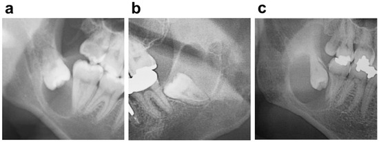 - Main, D.M. Follicular cysts of mandibular third molar teeth: Radiological evaluation of enlargement. Dentomaxillofac. Radiol. 1989, 18, 156–159. [Google Scholar] [CrossRef] [PubMed]