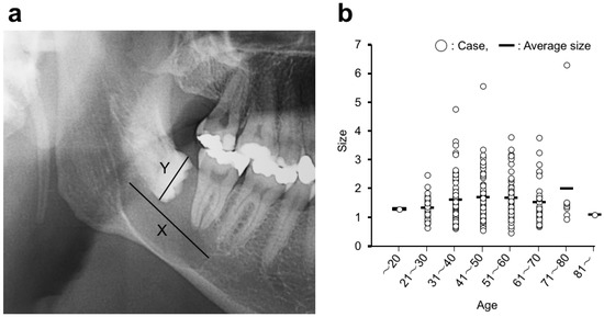 (a) The evaluation of the dentigerous cyst size on a panoramic radiograph. Cyst size = Length of the major axis of the radiolucent area (X)/Maximum width of tooth crown of associated third molar (Y). (b) Distribution of dentigerous cyst sizes.