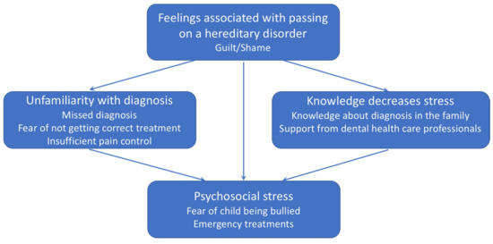 Four main themes emerged from the interviews with parents of children with severe forms of AI: Feelings associated with passing on a hereditary disorder, Knowledge decreases stress, Unfamiliarity with the diagnosis, and Psychosocial stress. In these main categories we identified several subthemes. Feelings associated with passing on a hereditary disorder included the subtheme of guilt/shame; Knowledge decreases stress included knowledge about diagnosis in the family and support from dental health care professionals; Unfamiliarity with diagnosis included missed diagnosis, fear of not getting correct treatment, and insufficient pain control; finally, the theme of Psychosocial stress included fear of child being bullied and emergency dental visits (Figure 1). Regarding the relation between the themes, unfamiliarity with the diagnosis increases and knowledge decreases psychosocial stress. Denial of problems from dental professionals also adds guilt and shame as well as frustration when not being able to explain the child’s problems.