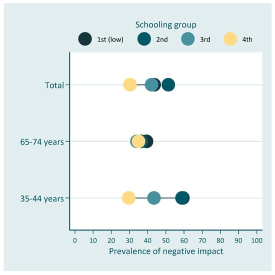 Prevalence of the negative impact of oral health on quality of life across education for the total population and among age-groups (equiplot). Schooling groups (in years of formal schooling): 1st = 0–3, 2nd = 4–7; 3rd = 8–11; 4th = 12+.