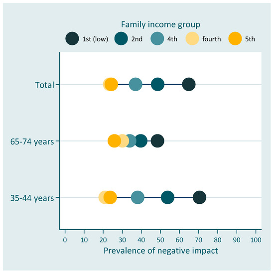 Prevalence of the negative impact of oral health on quality of life across family income for the total population and among age-groups (equiplot). Family income groups (in reais) = 1st = ≤500; 2nd = 501–1500; 3rd = 1501–2500; 4th = 2501–4500; 5th = 4501+.