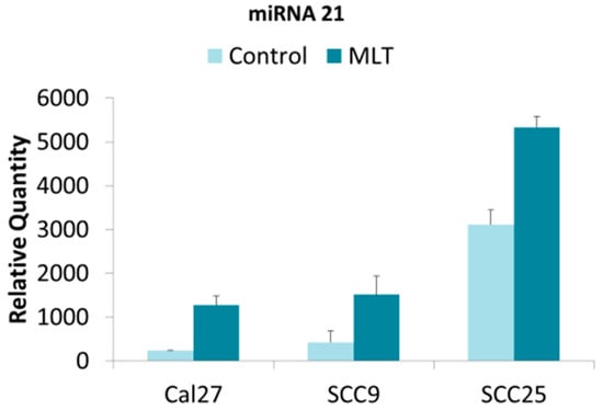 The results for miR-21 demonstrated that all three oral cancer cell lines exhibited miR-21 expression in the extracellular vesicle isolates, although the relative expression of miR-21 varied considerably (Figure 1). For example, the relative quantity of miR-21 in extracellular vesicles isolated from CAL27 and SCC9 in the negative controls was similar, but significantly lower than was observed in SCC25 cells. The addition of melatonin induced significant increases in the relative quantity of miR-21 in extracellular vesicles from all three cell lines (CAL27, SCC9, SCC25)—regardless of the baseline expression observed (p < 0.05).