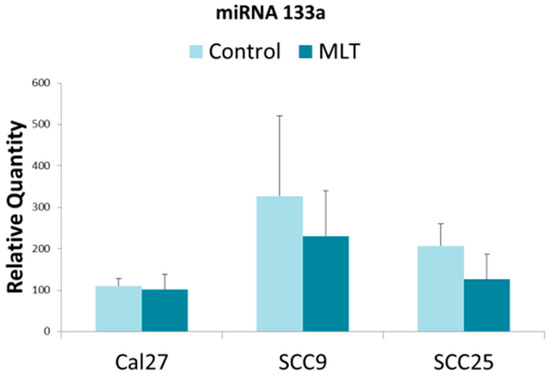 Relative miR-133a expression in oral cancers under melatonin (MLT) administration. Histogram of quantitative PCR from cDNAs derived from extracellular vesicles demonstrated differential baseline expression of miR-133a including standard deviation (SD), which was not significantly altered in any cell line under melatonin administration (CAL27, p = 0.11; SCC9, p = 0.634; SCC25, p = 0.411).