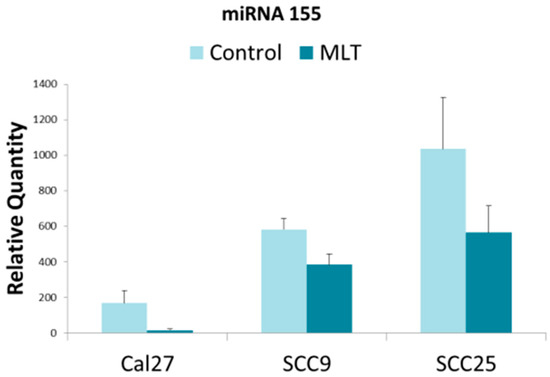 Relative miR-155 expression in oral cancers under melatonin (MLT) administration. Histogram of quantitative PCR from cDNAs derived from extracellular vesicles demonstrated differential baseline expression of miR-155 including standard deviation (SD). Administration of melatonin significantly reduced expression of miR-155 in all three cell lines, p < 0.05 (CAL27, p < 0.001; SCC9, p = 0.003; SCC25, p = 0.039).