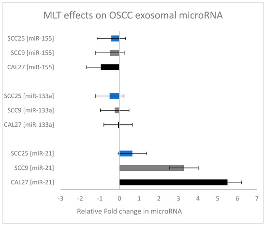 Relative fold change in microRNA expression in oral cancers under melatonin (MLT) administration. Calculation of the relative fold change in miRNA expression (experimental/baseline control) revealed significant increases in miR-21, with relatively little change to miR-133a and some inhibition of miR-155 (particularly in the CAL27 cells).