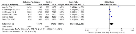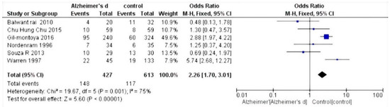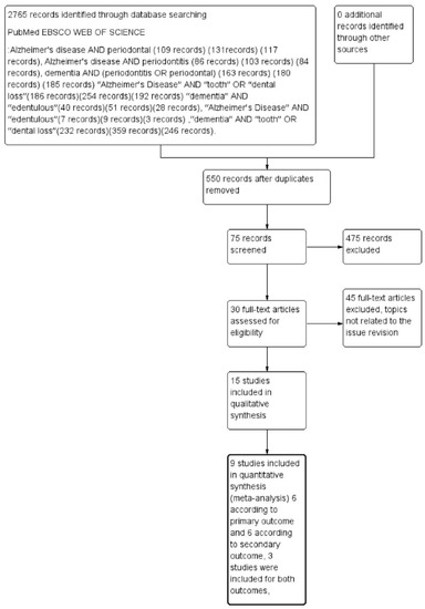 Eligible studies were those that determined a correlation between dementia in the course of Alzheimer’s and oral health; as criteria for inclusion in the meta-analysis, clinical case control studies that presented data regarding the loss or presence of teeth and edentulism were taken into consideration for both groups.