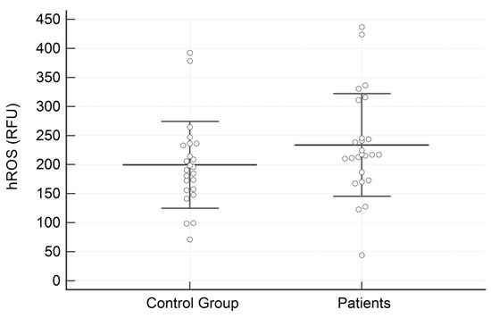 Results of the high reactive oxygen species (hROS) expressed in RFU in the two examined groups. Data are reported as Mean ± SD.