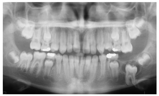 - Kushukakawa, J.; Irie, K.; Morimatsu, M. Dentigerous cyst associated with deciduous tooth: A case report. Oral Surg. Oral Med. Oral Pathol. 1992, 73, 415–418. [Google Scholar] [CrossRef]
