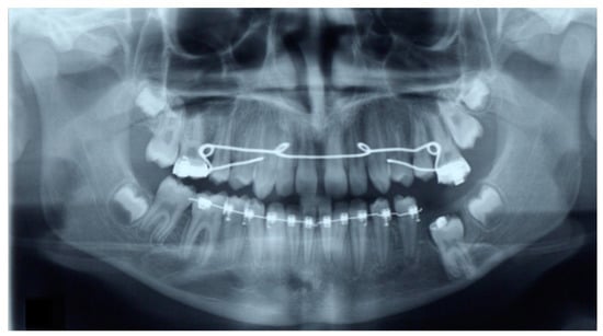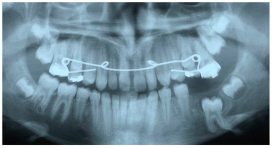 Immediately after debonding of the fixed orthodontic appliances of both dental arches. The mandibular left first molar was left to erupt spontaneously. Note that the maxillary molars are attached to one another via a stainless-steel wire in order to prevent further eruption of the first maxillary molar.