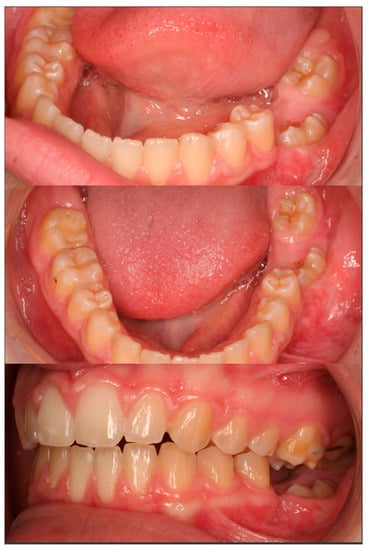 Tooth impaction can be defined as tooth retention due to an obstacle in the eruption path or—less commonly—due to an ectopic position of the tooth germ [1]. Tooth impaction is relatively common (prevalence of 17%) [2], third molars being the most commonly affected teeth, followed by maxillary canines, mandibular premolars, and mandibular canines. The prevalence rate of impaction for the mandibular second molar ranges from 0.06 to 0.3%, and for the mandibular first molar, the prevalence described is <0.01% [3]. Impaction of the first molar is a serious problem that needs to be addressed in order to achieve functional occlusion and facial harmony. In cases of non-treatment, it can cause a decrease in the vertical dimension of the lower face, malocclusion, extrusion of the antagonist, root resorption in the adjacent teeth, or formation of a dentigerous cyst [4,5].