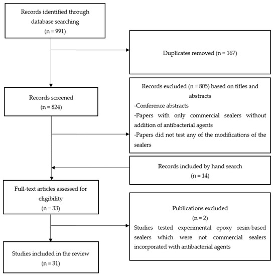 | (TITLE-ABS-KEY (“epoxy resin” OR epoxy-based OR amine-epoxy OR “amine epoxy” OR epoxy OR epoxide ) AND TITLE-ABS-KEY (sealer * OR sealing OR sealant * OR filling * OR cement *) AND TITLE-ABS-KEY (antibacterial OR antimicrobial OR antibiofilm OR anti-biofilm OR biofilm * OR fungus OR fungi OR fungal OR antifungal OR anti-fungal OR bactericidal OR infection OR antiinfective OR anti-infective OR microbial OR bacterial OR nanoparticle * OR antibiotic *)) | 335 |