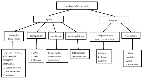 - Makvandi, P.; Jamaledin, R.; Jabbari, M.; Nikfarjam, N.; Borzacchiello, A. Antibacterial quaternary ammonium compounds in dental materials: A systematic review. Dent. Mater. 2018, 34, 851–867. [Google Scholar] [CrossRef]