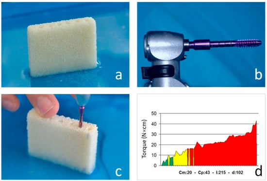 - Di Stefano, D.A.; Arosio, P.; Gastaldi, G.; Gherlone, E. The insertion torque-depth curve integral as a measure of implant primary stability: An in vitro study on polyurethane foam blocks. J. Prosthet. Dent. 2018, 120, 706–714. [Google Scholar] [CrossRef] [PubMed]