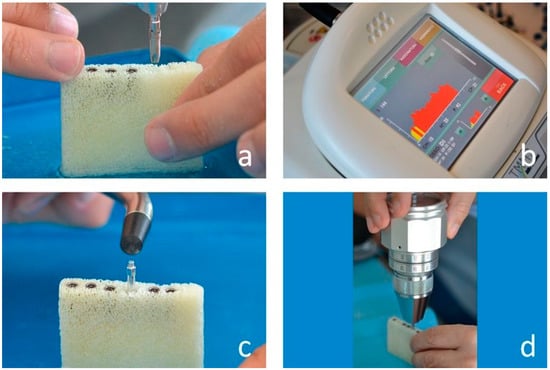 The density of each bone block was measured as follows. A narrow 14 mm-deep hole was prepared using a 2.2-mm-diameter drill. Depth was controlled using the correspondent drill stopper provided by the drilling set manufacturer (IDI Evolution, Concorezzo, Italy). Subsequently, a dedicated bone density measuring probe was mounted on the micromotor handpiece (Figure 1b) and the first probe thread was inserted in the access hole. The probe was let to screw into the hole at a given speed (30 rpm) (Figure 1c) and the device measured the friction with the bone walls (Figure 1d), a quantity related to, and therefore measuring, bone density. Six out of the fifteen blocks were chosen having density values as equidistant as possible throughout the whole density range, and six implants were inserted in each of them (Figure 2a). Site preparation was performed according to the drilling sequence advised by the implant manufacturer (Table 1). Implants were inserted at a constant speed of 35 rpm, that is, the same to be used in the clinical setting according to the implant manufacturer instruction for implant placement. The first set of six density measurements and six implant insertions in each of the six blocks was carried out in a dry condition. After that, six more bone density measurements and six more implant insertions were carried out in each block under irrigation. Irrigation was carried out using saline, at room temperature, and was external. During insertion, the micromotor displayed the quantities of interest (Figure 2b) that were also recorded in its solid-state memory and then downloaded to a USB key and hence to a personal computer for statistical analysis. After implant placement, Resonance Frequency Analysis (RFA) measurements were performed using an Osstell Mentor device (Osstell AB, Goteborg, Sweden) according to the manufacturer’s instructions (Figure 2c). One experimenter connected the SmartPeg (Osstell AB) to the implant using a manual wrench. The connection torque was 5 Ncm. Two ISQ measurements were then collected along 2 orthogonal directions, aiming the device probe at the SmartPeg. RT measurements (Figure 2d) were performed connecting a high-precision manual dynamometer (ATG6CN Torque Gauge; Tohnichi Mfg Co., Tokyo, Japan) to the implant and applying a counterclockwise torque. When the initial unscrewing of the implant occurred, an independent experimenter read the display, showing the correspondent RT value.