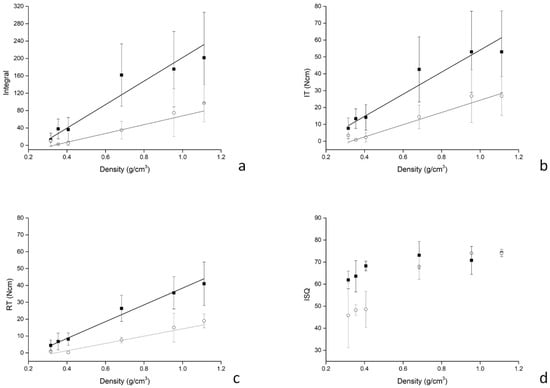 Plots showing how primary stability measurements, that is the (a) torque–depth curve integral, (b) the insertion torque (IT), (c) the reverse torque (RT), and (d) the implant stability quotient (ISQ) varied with density. Superimposed lines are those achieved by linear regression analysis. The slope of the integral–density curve (see values on y-axis in plot (a)) is greater than those of IT-density and RT-density, indicating that the integral is more sensitive to density variation than the other two parameters. The ISQ-density plot shows an altogether different shape (see text for comment).