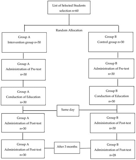At the end of each workshop, questionnaires were distributed again in the intervention and control groups. For determining the effect of time on the durability of the acquired knowledge, questionnaires were distributed after three months in both groups as well. The flow chart provides a detailed description of the steps taken in the study (Figure 1).