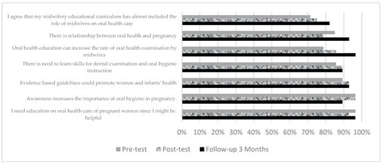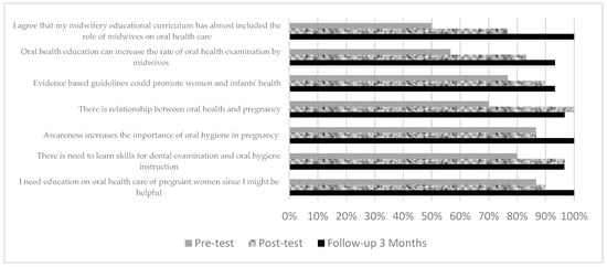 Although there are a few interventional studies among midwives, the contribution of our study is that the content was designed to improve knowledge on different areas of gingival health, dental decay, and oral health care in pregnancy in an academic setting [,]. The results of this study provide evidence on successful implementation of an educational intervention and highlight the eagerness and interest of future midwives. According to our results there is a significant relationship between attitude and willingness on providing oral health care for pregnant women. Pregnant women in a qualitative study in Iran also highlighted that positive attitude and friendly behavior of the dental health care providers influenced their oral health performance []. Literature shows that low attitudes and incorrect beliefs of midwives and nurses can act as a barrier to translating knowledge into practice [,]. This indicates that educational interventions besides increasing the knowledge level should also improve and emphasize the attitudes and willingness of the participating health care providers [,].
