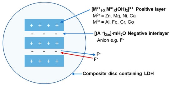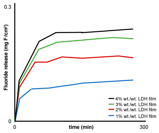 Various techniques were used to measure the concentration of fluoride in the release media: ion chromatography, ion-selective electrodes (ISEs) and ultraviolet–visible spectroscopy [27,28,29,30]. All the studies demonstrated the ability of LDH to release fluoride, e.g., Perioli et al. [30] reported an increase in fluoride release with an increase in LDH loading (1–4% w/w; Figure 4).