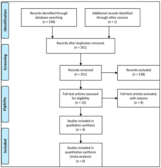 The initial electronic search using the keywords used above identified 258 articles. One article was found via a symposium program, which was also published in a peer-reviewed article (Key Engineering Materials). This article was not identified via the online database search. After excluding duplicates, 251 articles remained (Figure 2). After screening the title and abstracts of the remaining articles, 238 articles were removed for not meeting the set inclusion criteria. A detailed full-text review was performed on the 13 remaining articles, where a further nine were removed (Table 3) due to failure to meet the inclusion criteria. One clinical study and three non-clinical articles were identified during the search and included in this review.