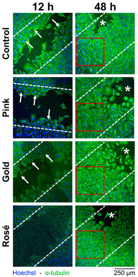 Results of the cell migration assay are summarized in Table 3, with representative images shown in Figure 2. At 12 h, the cell-free area (in µm2) ranged from 97.5 ± 24.1 to 212.7 ± 24.3 in the Control and Gold groups, respectively. The difference among the groups was statistically significant (p = 0.000), with the Control group showing a significantly lower value compared to the other groups. At 24 h, the cell-free area ranged from 28.0 ± 25.7 to 122.6 ± 73.1 in the Control and Rosé groups, respectively. The difference among the groups was statistically significant (p = 0.019), with the Rosé group showing a significantly greater value compared to the Control group. At 40 h, the cell-free area ranged from 0.3 ± 0.5 to 28.8 ± 22.2 in the Control and Rosé groups, respectively. The difference among the groups was statistically significant (p = 0.005), with the Rosé group again showing a significantly greater value compared to the Control group. At 48 h, no cell-free area was detected in any group.