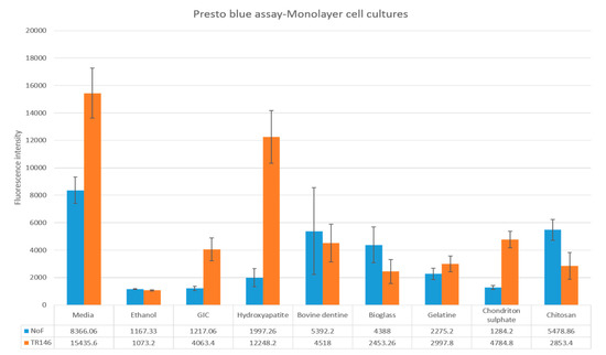 Cell viability of normal oral fibroblasts (NOFs) and TR146 exposed to test materials (10% by weight bioactive material and 90% glass ionomer cement (GIC)) and GIC discs used as a control.