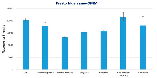 The results of tissue viability assay for 3D-OMM exposed to test materials are shown in Figure 2. Statistical analysis showed that bovine dentine-, gelatine- and bioglass-modified samples had significantly lower tissue viability compared to control GIC (p value < 0.05). The other test groups (hydroxyapatite, chondroitin sulphate and chitosan) showed no statistical significance difference compared to the control group.