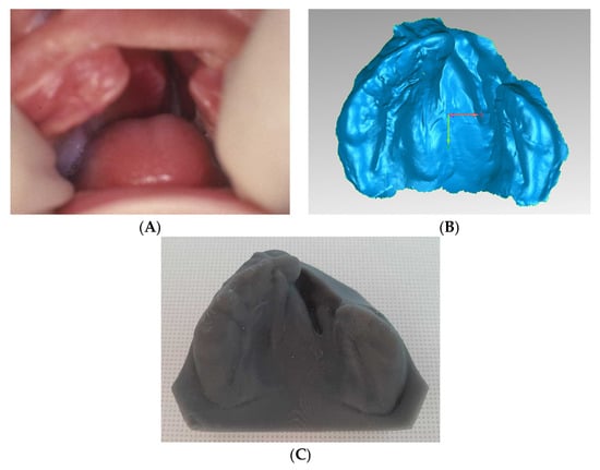 Without proper early management, a complete unilateral cleft lip and palate patient growth is characterized by a severe nasal deformity, an outward, non-cleft side, maxillary alveolar process rotation and a medial movement of the cleft side, smaller alveolar segment [,]. Primary alveolar surgical repair is therefore done early in the cleft lip and palate (CLP) patient life, frequently after pre-surgical orthopedic treatment (PSOT) with an acrylic intra-oral passive molding plate, allowing the patient to feed, separating the oral from the nasal cavity, and guiding the growth process of maxillary stumps—“alveolar molding”—in order to facilitate surgery and ameliorate the results achieved [,,]. The alveolar molding is accomplished through serial adjustments, removing hard acrylic from the areas the segments are being directed toward and adding soft liner material to the regions where force must be applied to the segments to accomplish the movement. Weekly visits are required to modify the molding plate to guide the alveolar cleft segments into the desired position [,,]. Sometimes, this plate has to be substituted with additional impressions, in order to follow patient growth [,,].