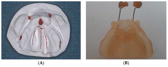 Virtual impressions were resin printed in order to obtain physical models, and molding plates were fabricated using a conventional acrylic dental resin-based protocol (Figure 1). PSOT with a 24 h worn passive plate, covering the palate and the alveolar ridges and blocking the cleft in both the hard and soft palate, started within the first two weeks after birth. One or two nasal stents, added to the molding plate labial vestibular flange, were used to achieve nasal symmetry and nasal tip projection (Figure 2). The orthopedic appliances were held in place with surgical tapes or with a head bonnet with elastic strips, or with both methods. Patients returned to the clinic every three weeks for plate adjustment and, if necessary, substitution. All patients were administered three to five months of orthopedic treatment before primary gingivoperiosteoplasty. Molding plate was not used after surgery.