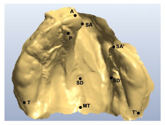 Two operators independently evaluated treatment quality, comparing pre- and post-molding therapy models and extra oral pictures of digital and non-digital protocols patients. The following landmarks (Figure 3) were selected on both pre- and post-molding therapy models: the most anterior point on the greater segment (A), the center of the papilla incisiva (P), the points that have the shortest connection line passing over the anterior cleft (SA and SA’), the tuberal areas (T and T’), the dissecting point on the connecting line between tuberal areas (MT), the points that have the shortest distance passing over the cleft posterior on the hard palate (SD and SD’) (Figure 3). Then, they measured A-MT, SA-SA’, T-T’, and SD-SD’ segments’ length and calculated the difference between pre- and post-molding therapy models, obtaining the outcome measures for statistical analysis []. Nasal symmetry and nasal tip projection were evaluated postoperatively. Nasal symmetry was evaluated on frontal cropped pictures on a 3-point ordinal scale in terms of symmetry of alar bases, and the vertical and horizontal dimensions of nostrils: Excellent—symmetry of all three components; Mild asymmetry—asymmetry of one component; Unsatisfactory—asymmetry of more than one component []. Nasal tip projection was evaluated on lateral cropped pictures on a 5-point (Excellent, Very good, Good, Satisfactory, Poor) ordinal scale in comparison to standardized reference photographs of treated patients []. Surgical records were analyzed to evaluate surgical challenge in terms of time taken for the surgical procedure, extension of subperiosteal dissection, and soft tissue tension after repair: for these last two parameters, the surgeon was asked to express, based on his personal experience and feelings, a judgement of less, equal, or more than usual.