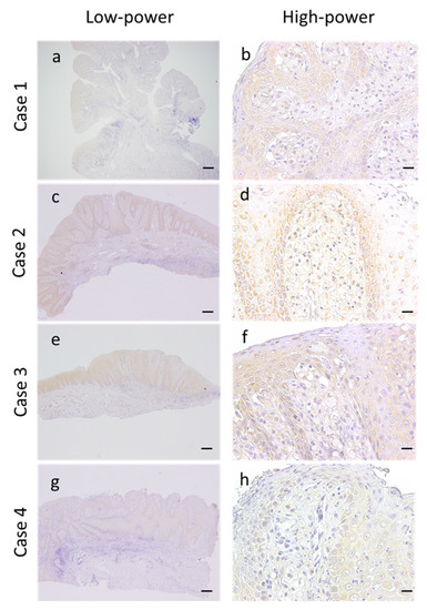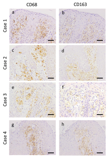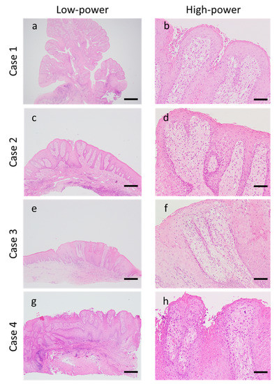 Morphological evaluation was performed using HE-stained specimens. Epithelial acanthosis with no atypia was observed in all patients with OVXs. In all patients, numerous foamy cells were accumulated in the connective tissue papillae, and mild-to-moderate degree of chronic inflammatory cells infiltration containing primarily lymphocytes into the connective tissue was observed. Case 1 alone was classified into the verrucous type, which is characterized by an elevated and well-circumscribed architecture. The remaining three cases were classified as flat type, which exhibits a flat surface and epithelial proliferation below the surface (Figure 1a–h and Table 1).