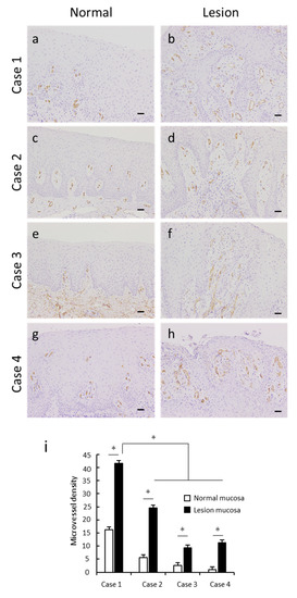 Angiogenesis in oral verruciform xanthoma. Representative CD34 images of oral verruciform xanthoma. (a,c,e,g) Few CD34-postive capillaries and small vessels with lumens were observed in the normal mucosa of all patients. (b,d,f,h) Vascularization of several elongated small blood vessels was observed in the connective tissue papillae in the lesioned mucosa of all patients (scale bar, 50 µm; original magnification, 200×). (i) Microvessel density (MVD) of all oral verruciform xanthoma cases was significantly higher than that of the corresponding normal epithelia. MVD was evaluated within 100 μm of the stroma from the superficial epithelium. The MVD of verrucous-type OVX was higher than that of the flat-type cases. CD34-postive capillaries and small vessels with lumens were selected, and the numbers of microvessels were counted as MVD (per 200× field). * p < 0.05 by t-test.