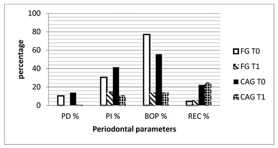 The intra-group comparisons (T1 vs. T0) showed statistically significant decreases in both groups for PD (FG: Δ, −9.2 IQR, −22.5, −5.5; p = 0.0001; CAG: Δ, −12.6 IQR, −25.4, −4.8; p = 0.0002), BOP (FG: Δ, −53.5 IQR, −70.5, −37; p = 0.0001; CAG: Δ, −37.5 IQR, −54.5, −23; p = 0.0002), and PI (FG: Δ, −17.5 IQR, −62.5, 14.5; p = 0.04; CAG: Δ, −24 IQR, −49.5, −5; p = 0.002) (Table 2). REC increased significantly only in the FG (Δ, 1.3 IQR, 0, 3.4; p = 0.006), as shown in Table 2 and Figure 1.